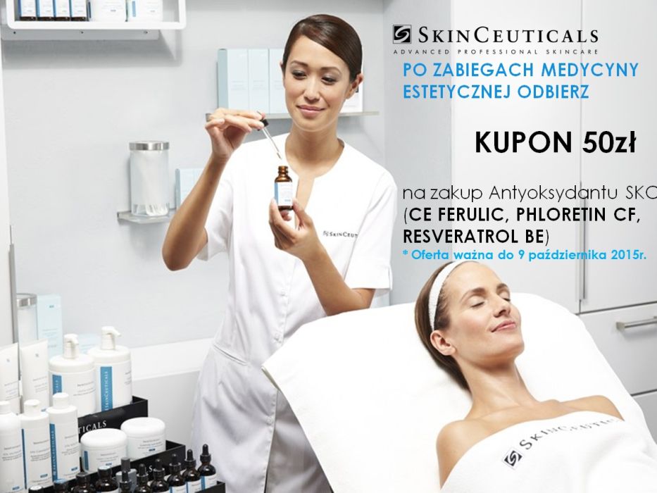 Wykonaj w Klinice dr Jagielskiej dr Jagielskiej dowolny zabieg medycyny estetycznej i odbierz kupon o wartości 50 zł na kosmetyki SkinCeuticals (dotyczy antyoksydantów CE FERULIC, PHLORETIN CF, RESVERATROL BE). Promocja obowiązuje w dniach 14.09 – 099.10.2015 r. Jeden zabieg upoważnia do odebrania jednego kuponu.